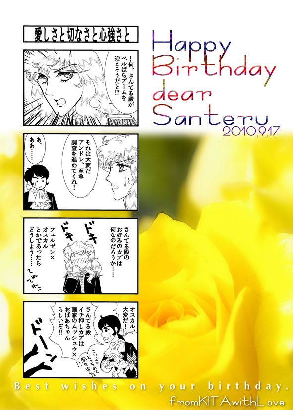 | 動画サイトでアニメ『ベルサイユのばら』を楽しんでいた2010年にKITAさんから頂いた、お誕生日プレゼントの4コマ。 | |
